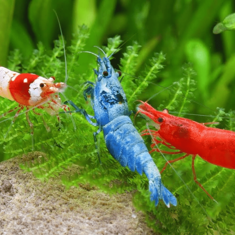 • Tôm xanh Taiwan: Có màu sắc đặc biệt, thường là màu xanh lam hoặc xanh dương đậm, rất được ưa chuộng trong các bể thủy sinh cao cấp.